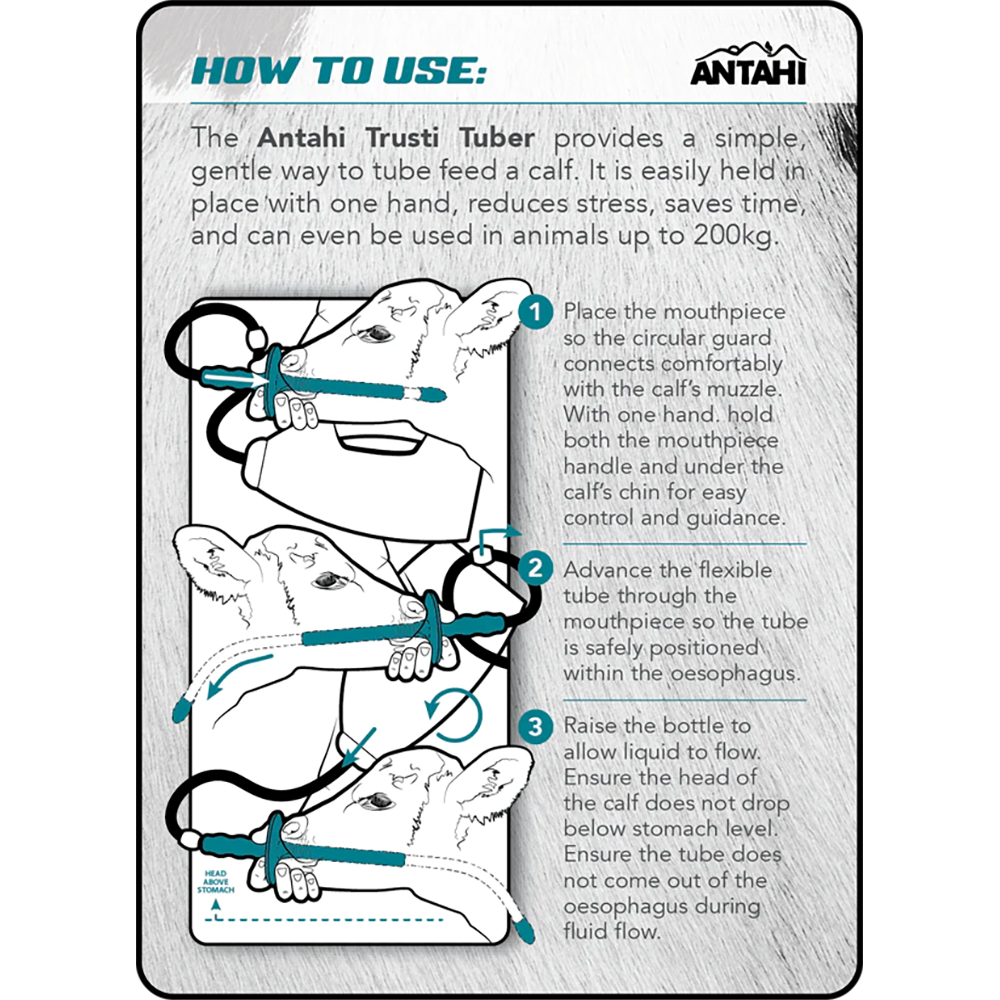 Trusti Tuber is the award-winning, farmer/vet-designed calf feeder for safe, stress-free transitions between fluid & teat feeding. Prevents bruising, promotes calf well-being & comfort. Suitable for weak calves, tube feeding, rehydration, & bloat relief. Now available in standard size and extra-small for dainty calves. Starter kits include 4 L bottle, teat cap and drench probe. Replacement drench probes available.