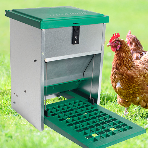 Feeders designed to dispense feed to chickens and other poultry birds in a controlled manner, ensuring they have access to a consistent and sufficient supply of food.