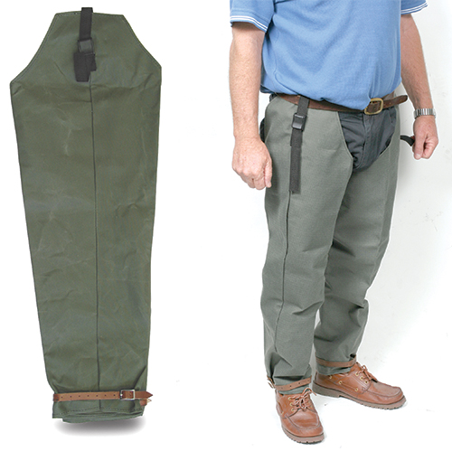 Canvas pull-on chaps are a crucial piece of protective equipment for farmers, constructed of sturdy canvas material to safeguard the legs while working in hazardous conditions.